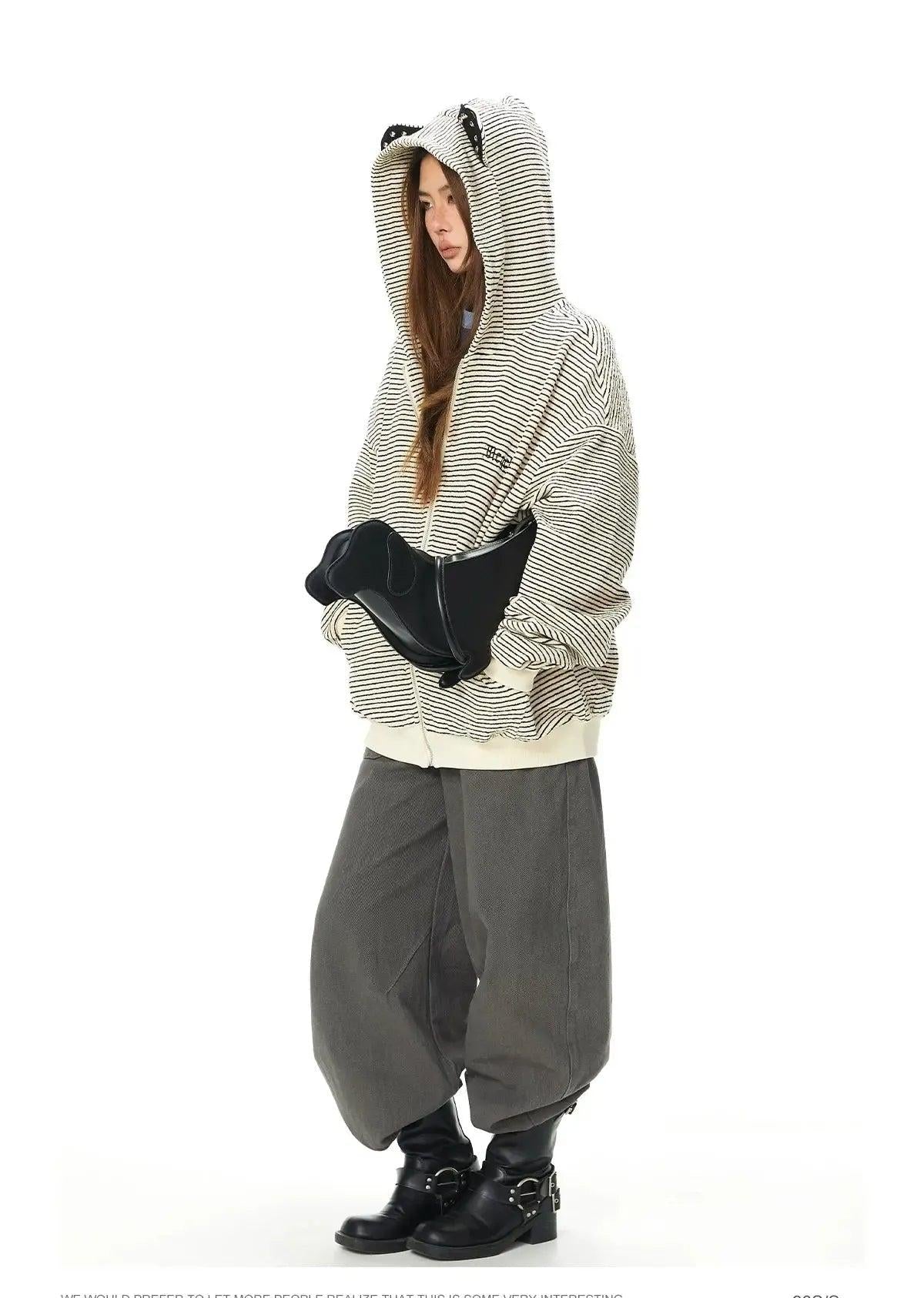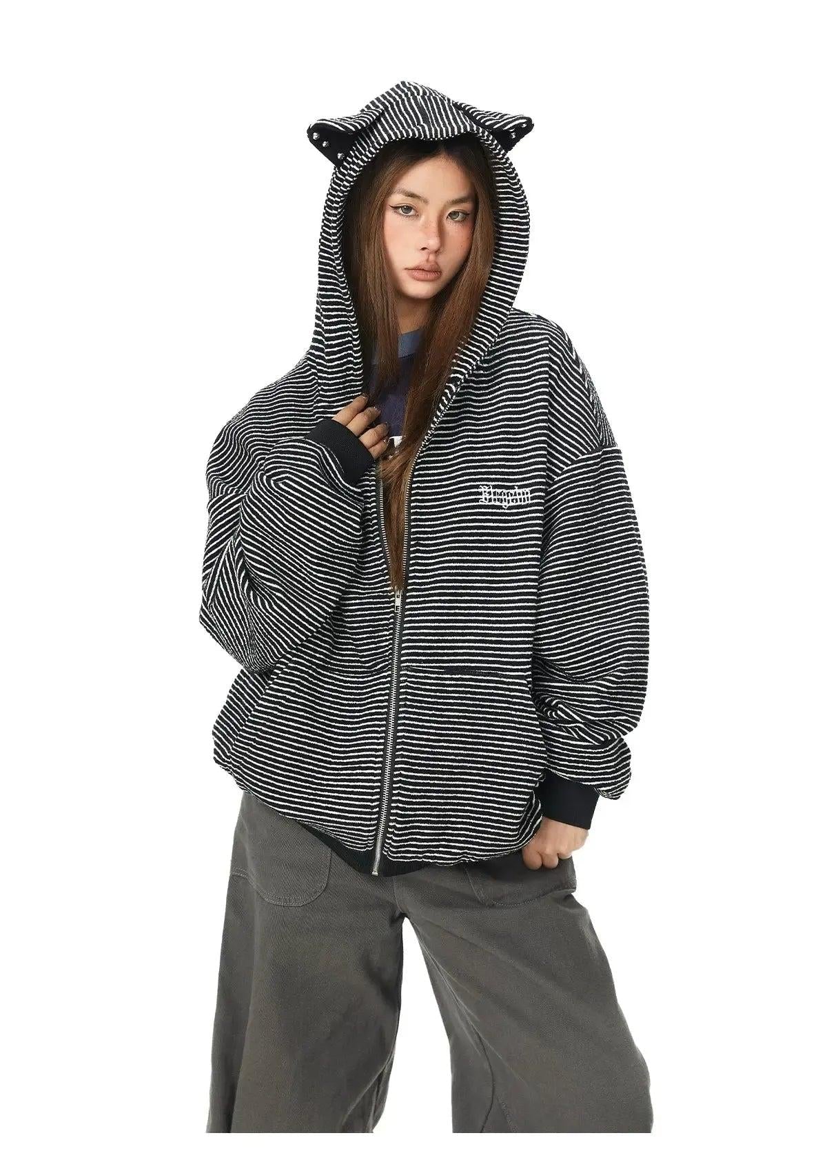 BB Cat Ears Thin Striped Zip-Up Hoodie