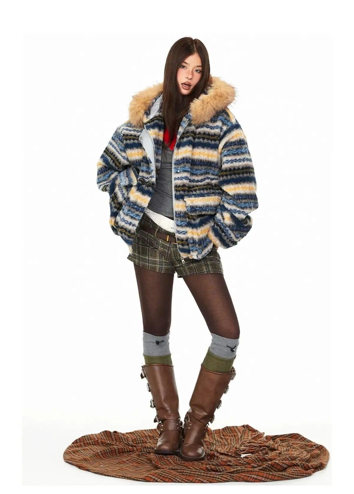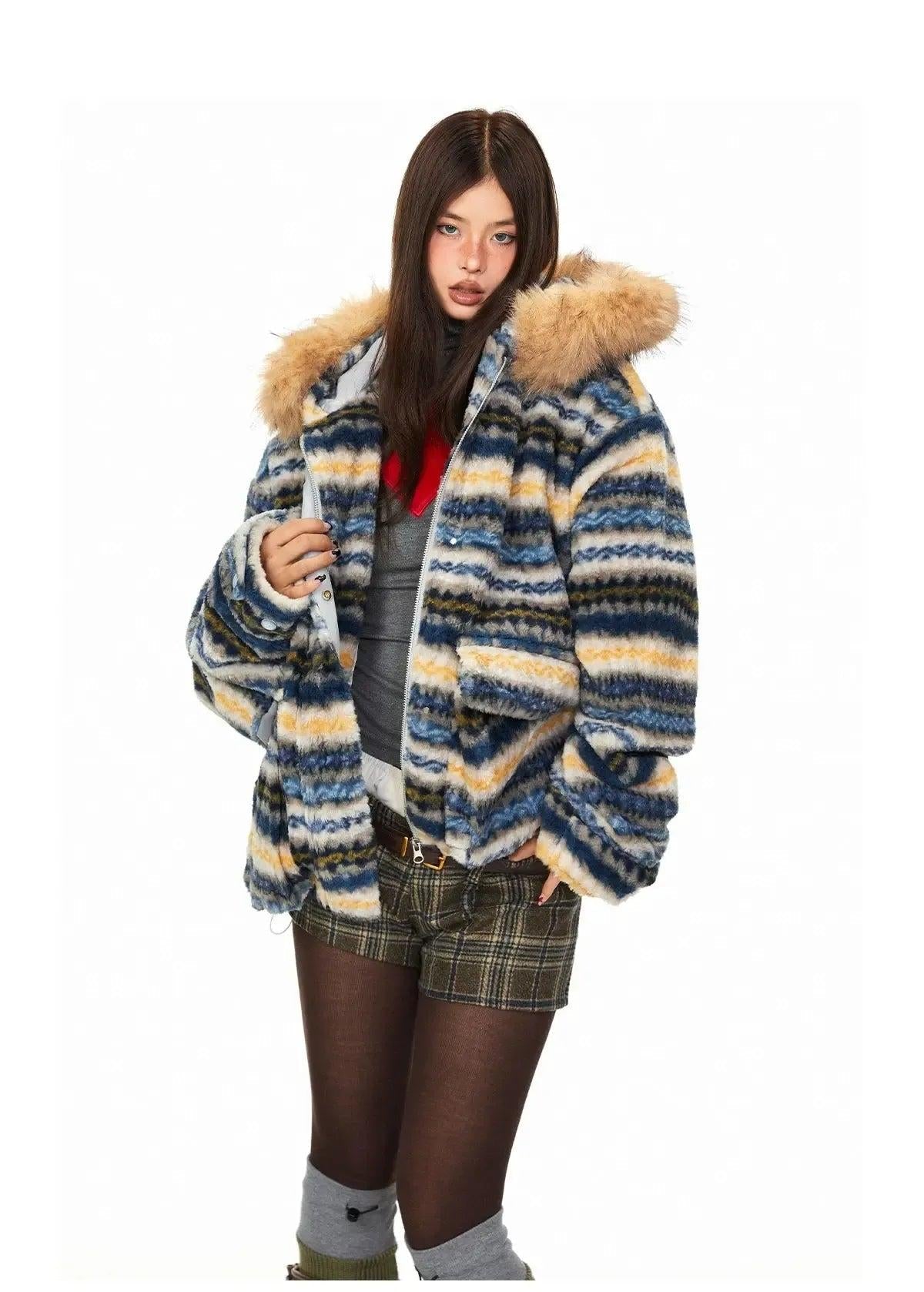 BB Faux Fur Trim Hood Patterned Fleece Jacket