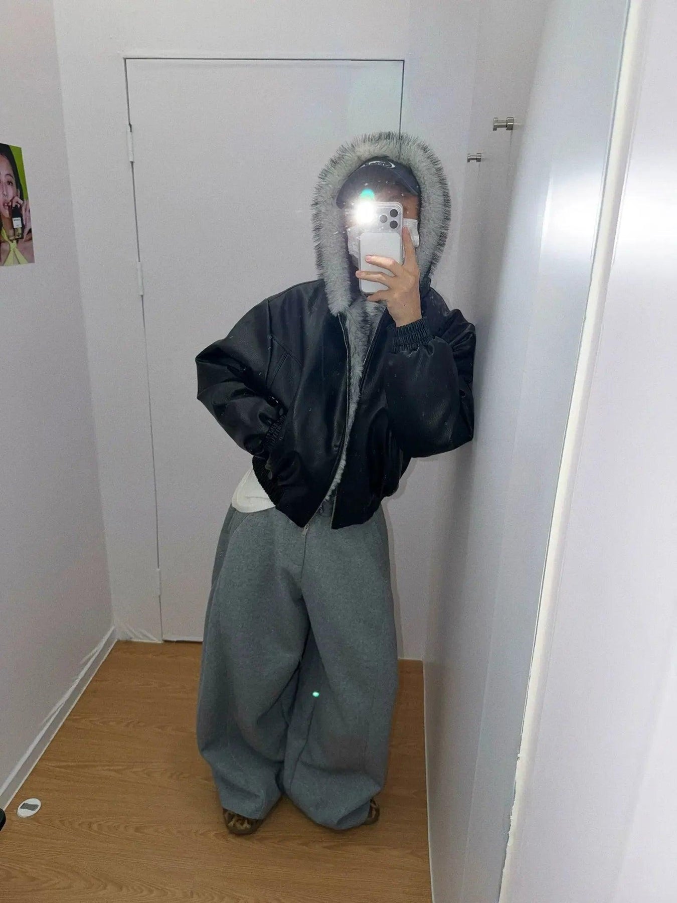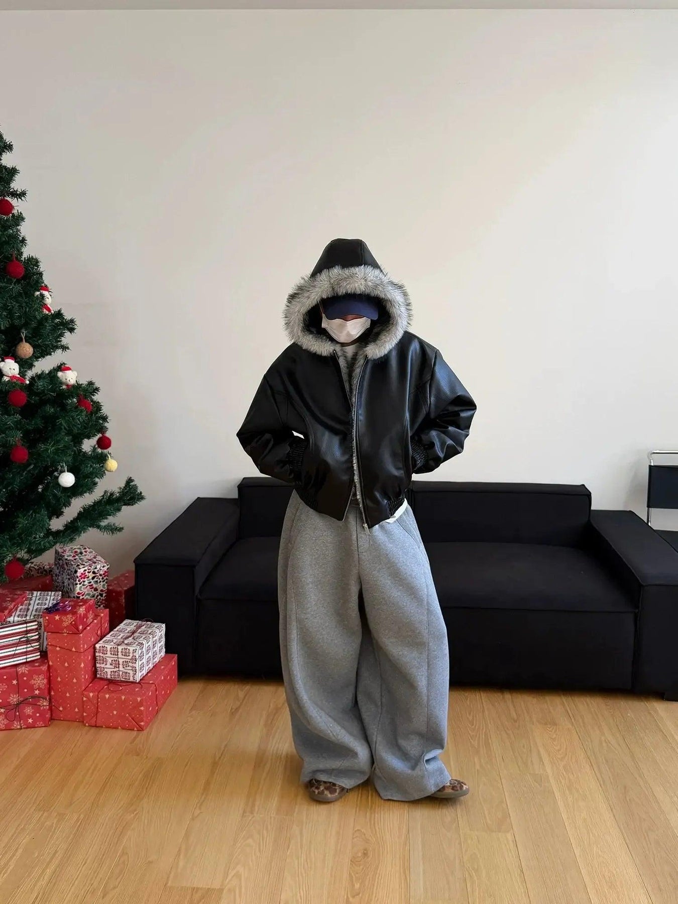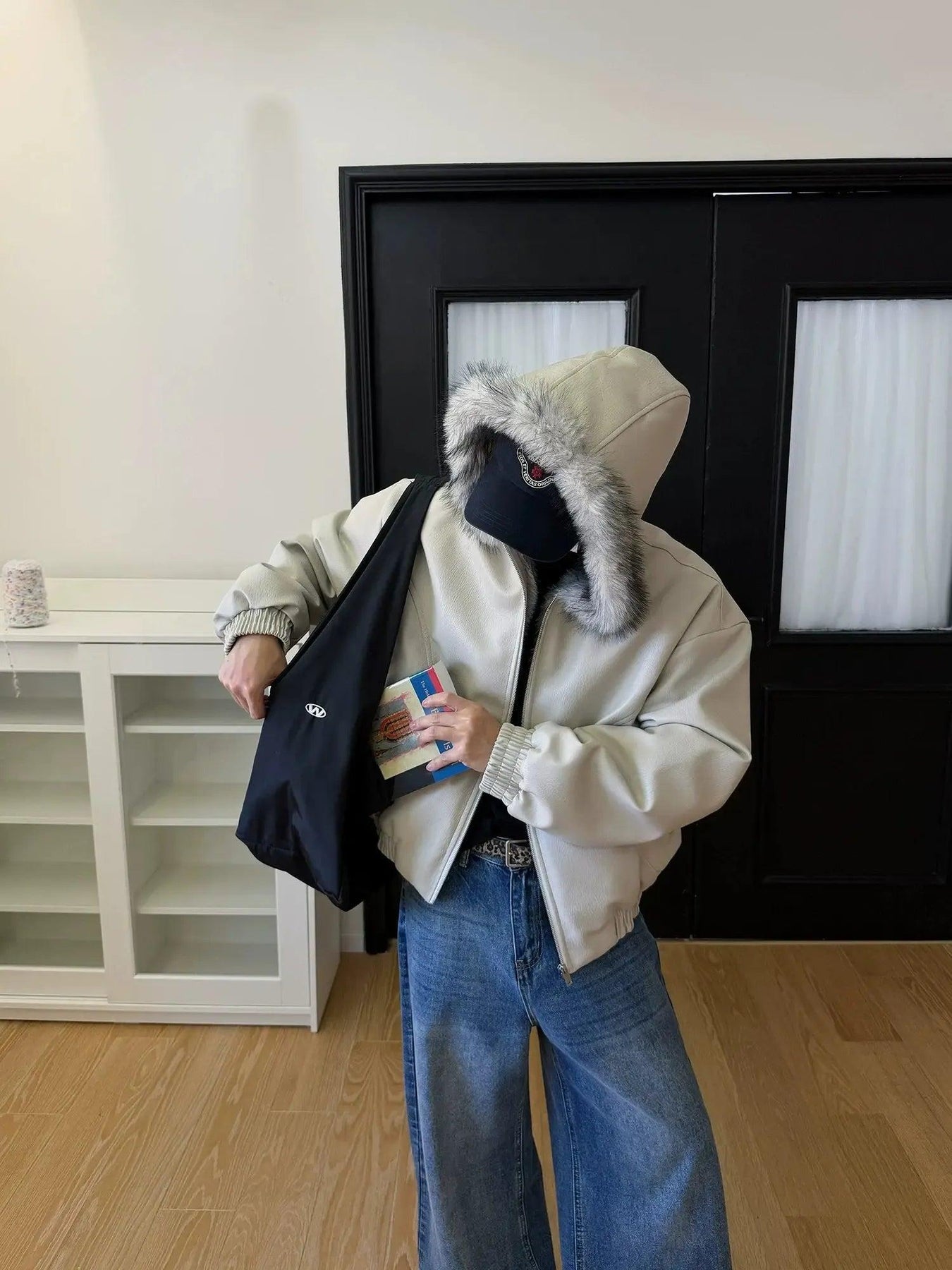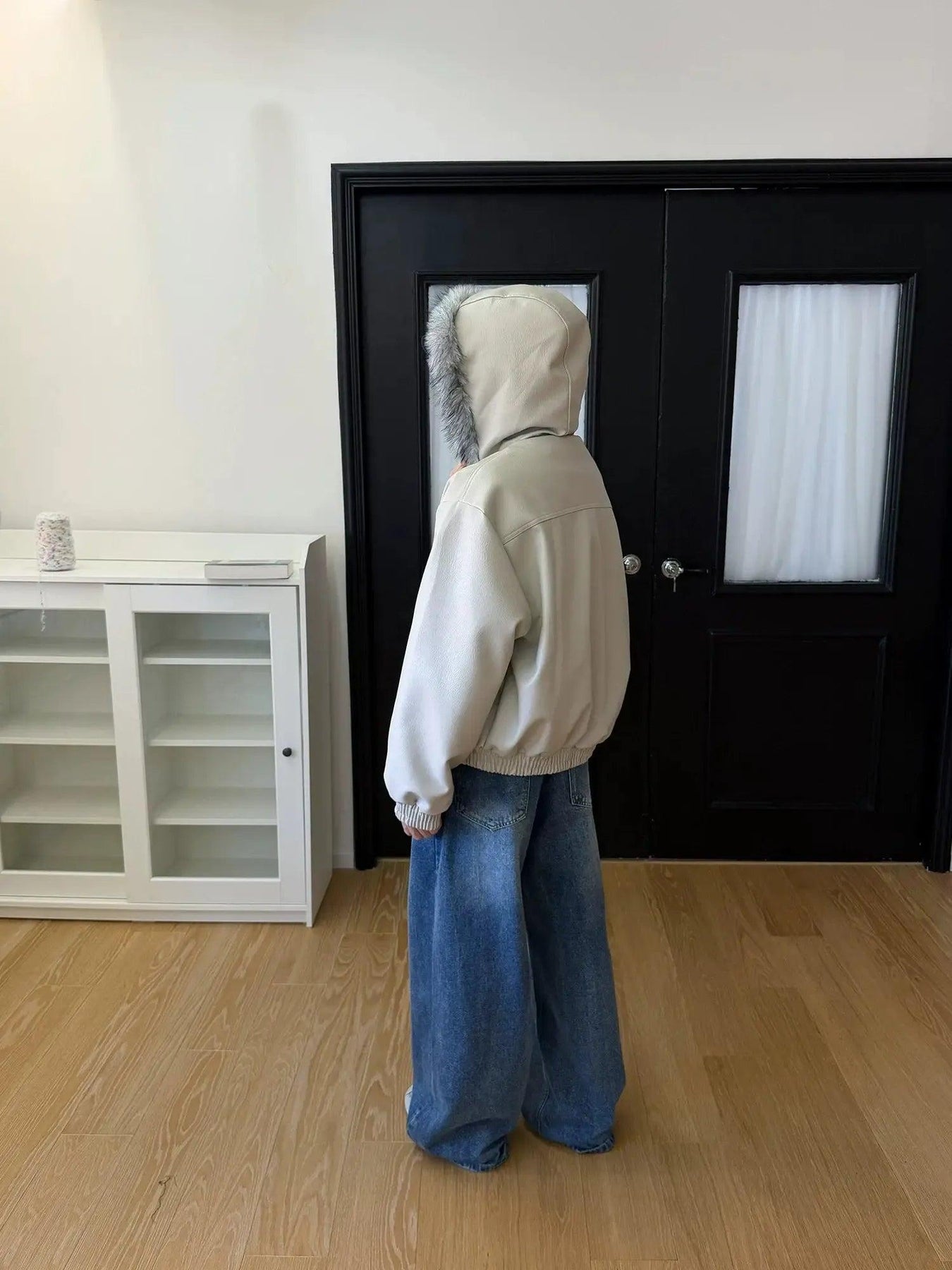 Nine Fur-Trimmed Hood PU Leather Jacket